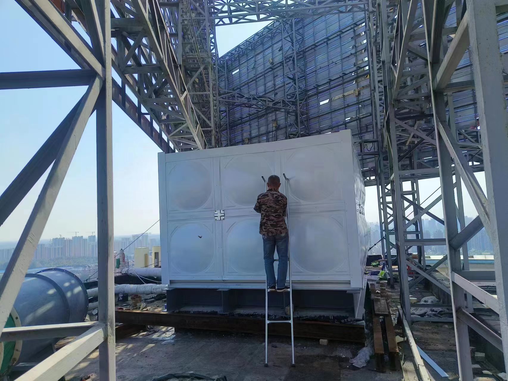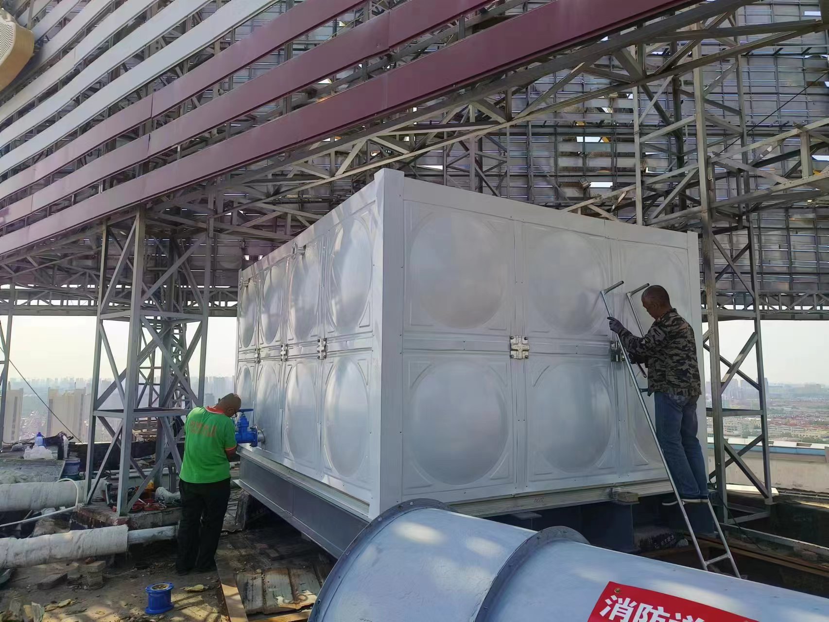 德州德百物流批發城24立方玻璃鋼聚氨酯彩鋼板保溫水箱已經安裝完畢,此次安裝的進度也非常快,在規定的時間內完成了安裝和試水,得到了客戶的認可。您的認可就是對我們鼓勵。